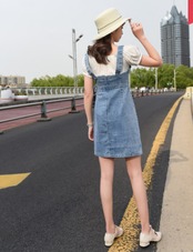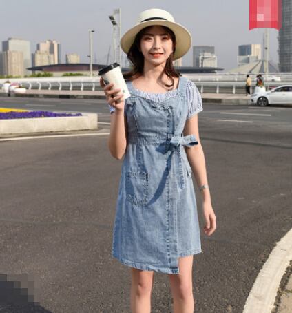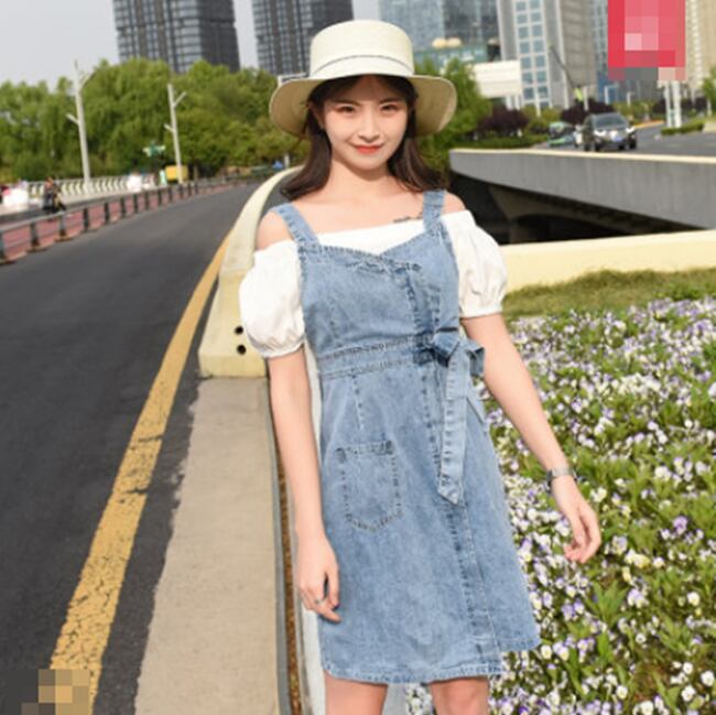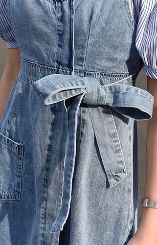 全2色 フェイクツーピース ジャンパースカート サロペットスカート デニムサロペット ワンピース オフショルダー リボン ショート丈 タイト カジュアル お出かけ 可愛い デート ユニーク ジーンズ ストライプ 韓国ファッション 夏