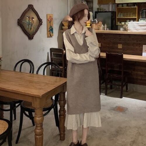 全2色 セットアップ ツーピース 2点セット シャツワンピース ベスト ミモレ丈 大人 ゆったり レトロ テントシルエット Vネック 長袖 プリーツ レイヤード カジュアル デイリー 秋 春 冬