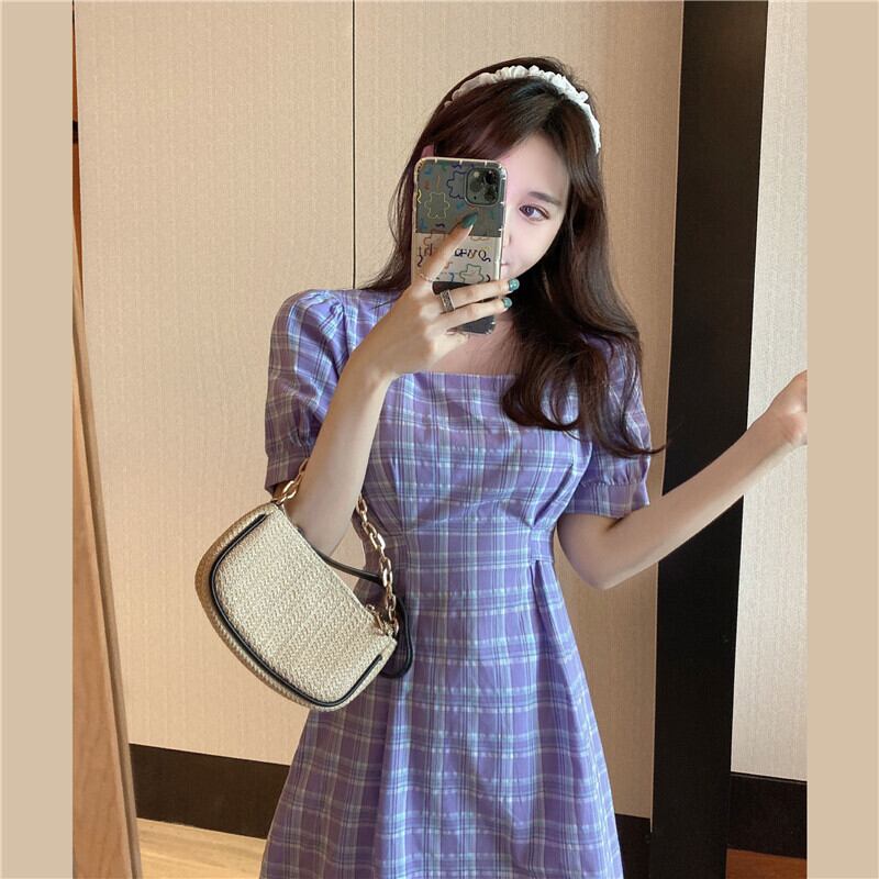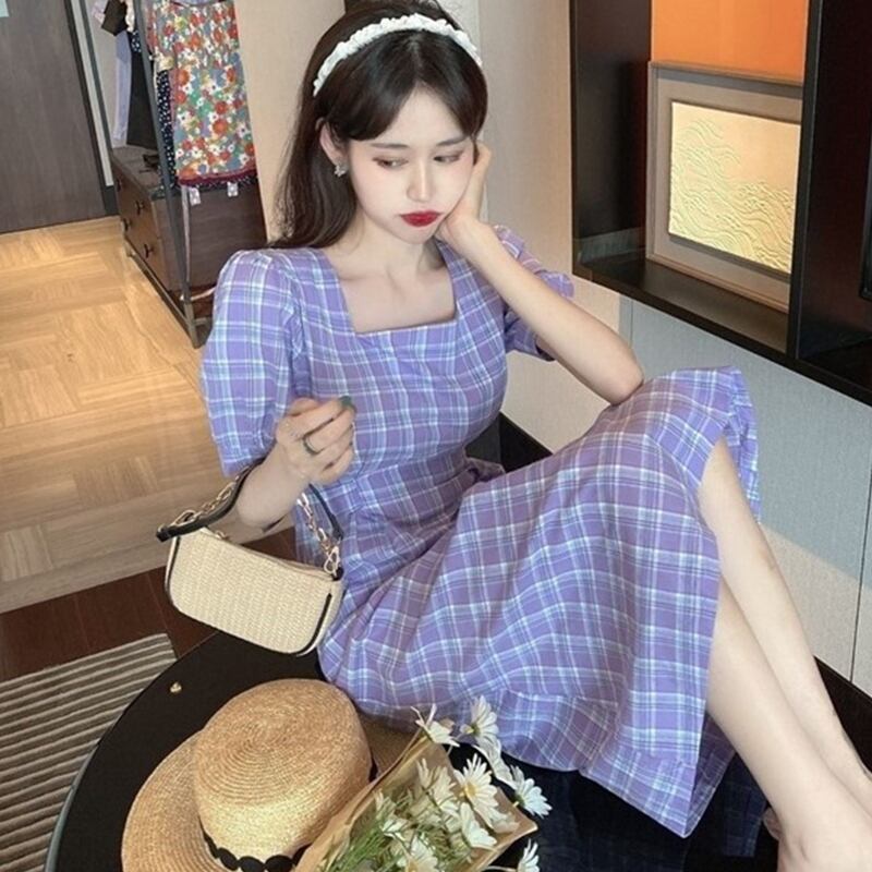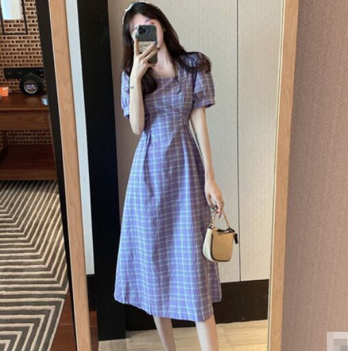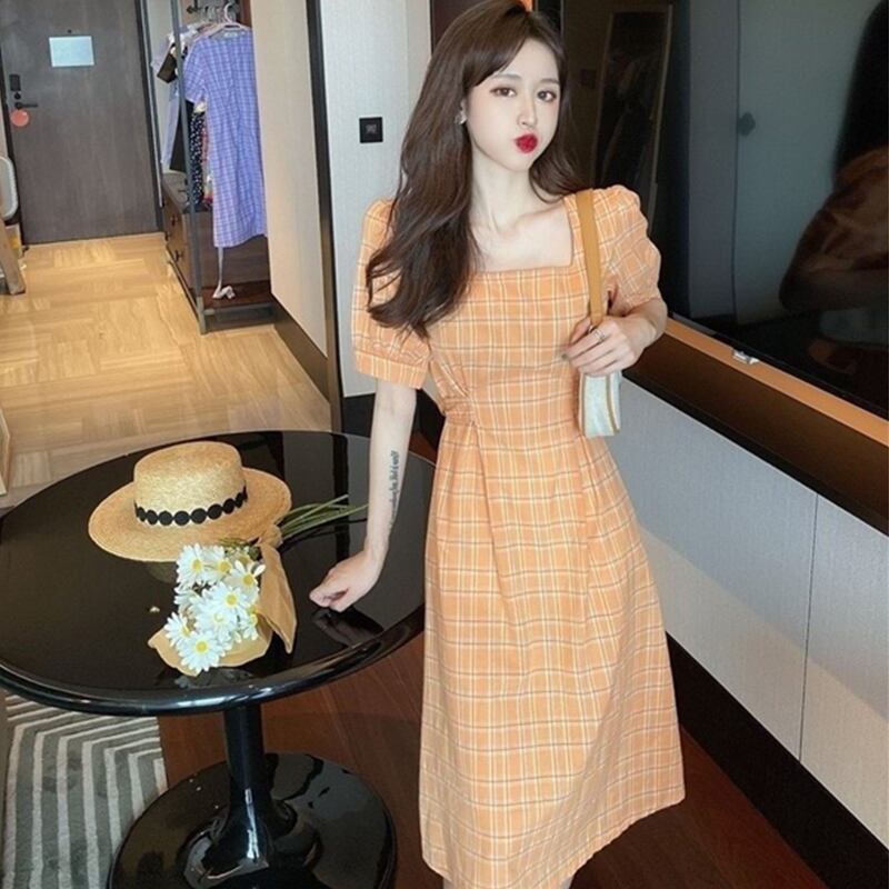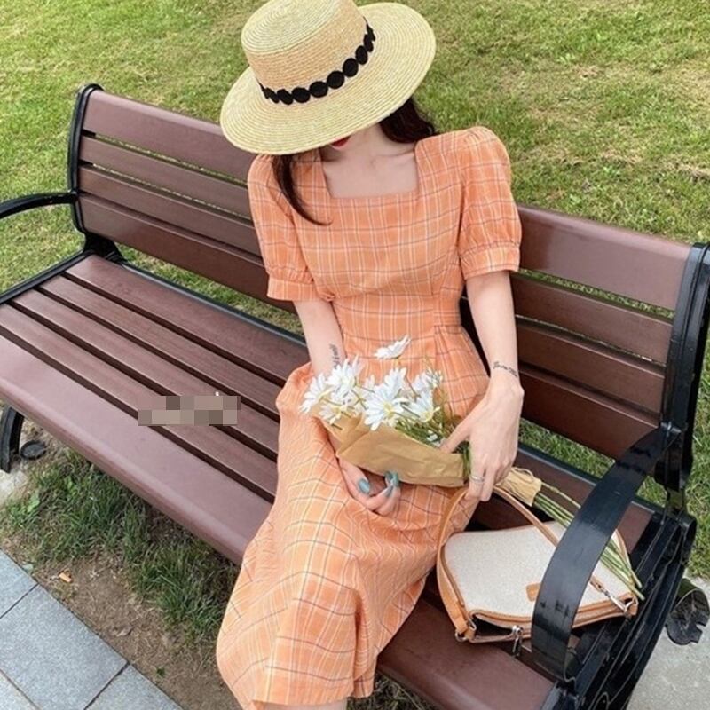 全2色 ワンピース チェック柄 ミモレ丈 スクエアネック 半袖 パフスリーブ フレア 大人可愛い カジュアル デイリー お出かけ デート リゾート レトロ 夏