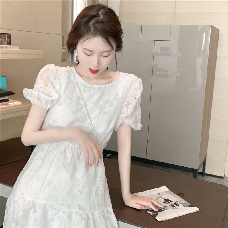 ワンピース バックシャン バックコンシャス 背中開き 背中見せ 蝶 シースルー ガーリー バックリボン 半袖 ロング丈 可愛い 上品 パフスリーブ ラウンドネック カジュアル きれいめ リゾート 夏