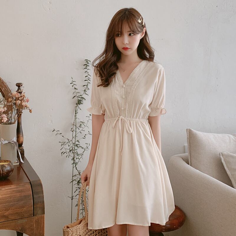 全2色 ワンピース ショート丈 フレア ボタン Vネック Aライン 半袖 パフスリーブ ウエストシャーリング ウエストリボン ガーリー 可愛い 上品 カジュアル お出かけ デート リゾート 夏