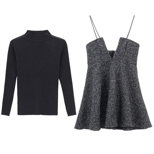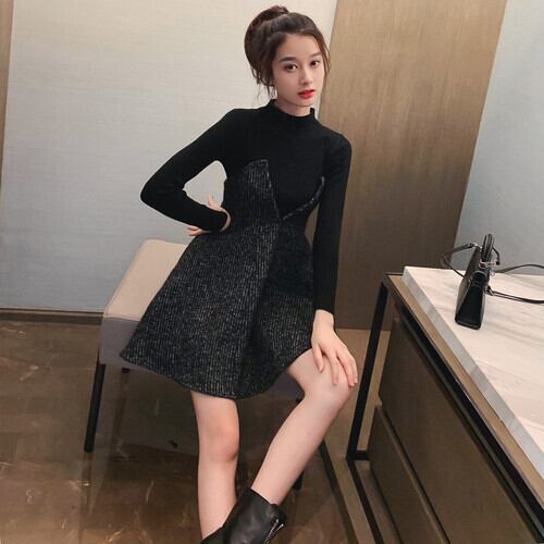 セットアップ ハイネック リブニット 長袖 ワンピース ミニ丈 Aライン ハイウエスト 脚長効果 スタイルアップ 2点セット 秋冬 お出かけ デート 女子会 カジュアル きれいめ 大人可愛い フェミニン ガーリー ブラック ワントーンコーデ