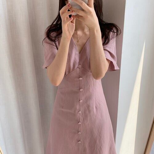 全2色 ワンピース Vネック 半袖 フロントボタン ひざ丈 ミディ丈 フレアスカート 無地 きれいめ カジュアル シンプル レトロ リゾート デイリー 夏 ブルー ピンク