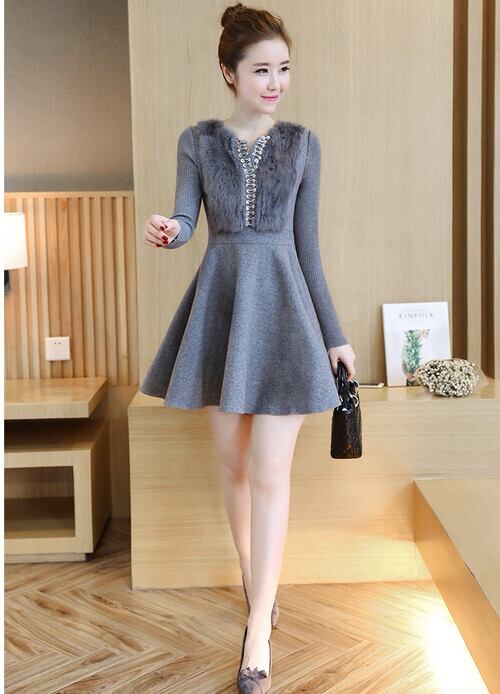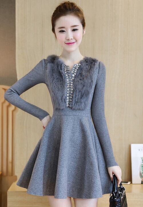 全2色 ワンピース ミニ丈 Aライン クルーネック リブ 長袖 ビジュー スパンコール ファー スキッパー タイト 秋冬 お出かけ デート 女子会 謝恩会 発表会 二次会 同窓会 きれいめ フェミニン 大人可愛い 上品 エレガント ガーリー