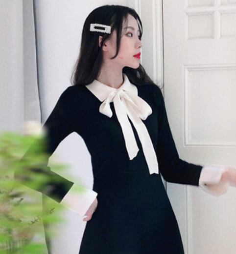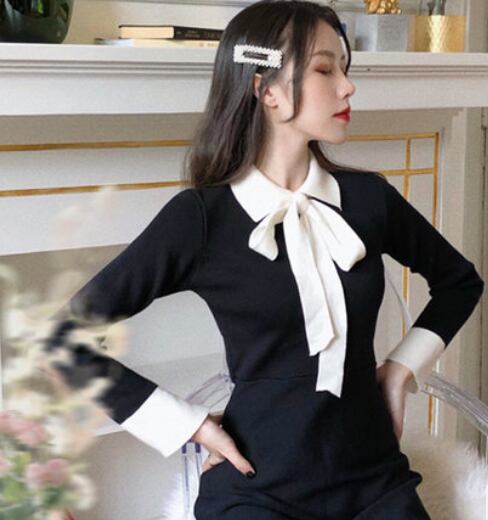 ワンピース ボウタイネック ネックリボン スリム ショート丈 バイカラー 上品 大人可愛い ガーリー 長袖 お呼ばれ デート 女子会 カジュアル きれいめ 秋 春