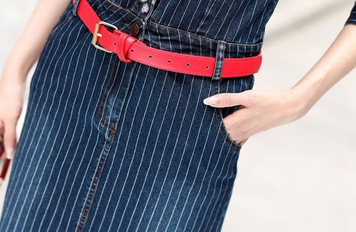 デニムワンピース ワンピース ミモレ丈 ストライプ 花 フロントボタン スリム タイト ウエストベルト 襟 7半袖 大人 上品 カジュアル きれいめ お出かけ デート 韓国ファッション 夏 秋
