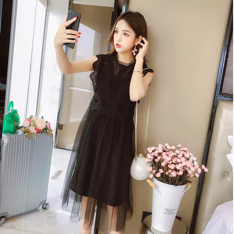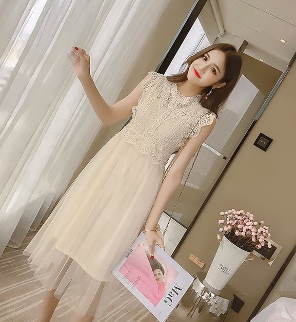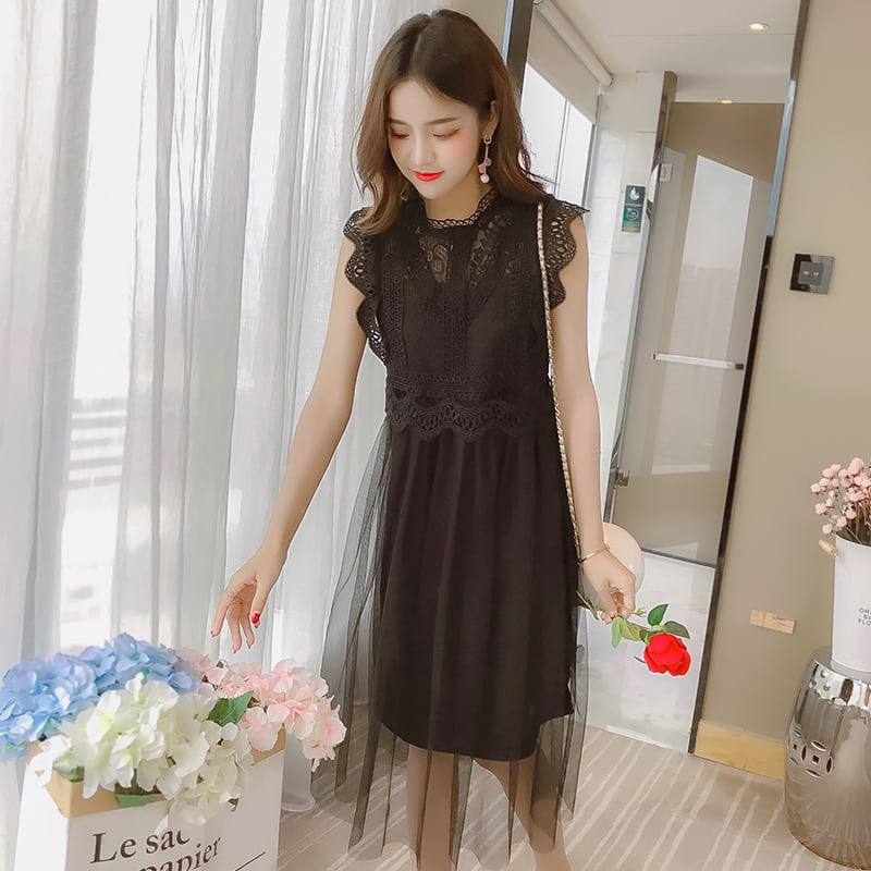 全2色 ワンピース レース ドレス フレア チュール ノースリーブ シースルー ボトルネック ミモレ丈 ガーリー 可愛い カジュアル きれいめ 上品 きれいめ お呼ばれ 女子会 デート 夏