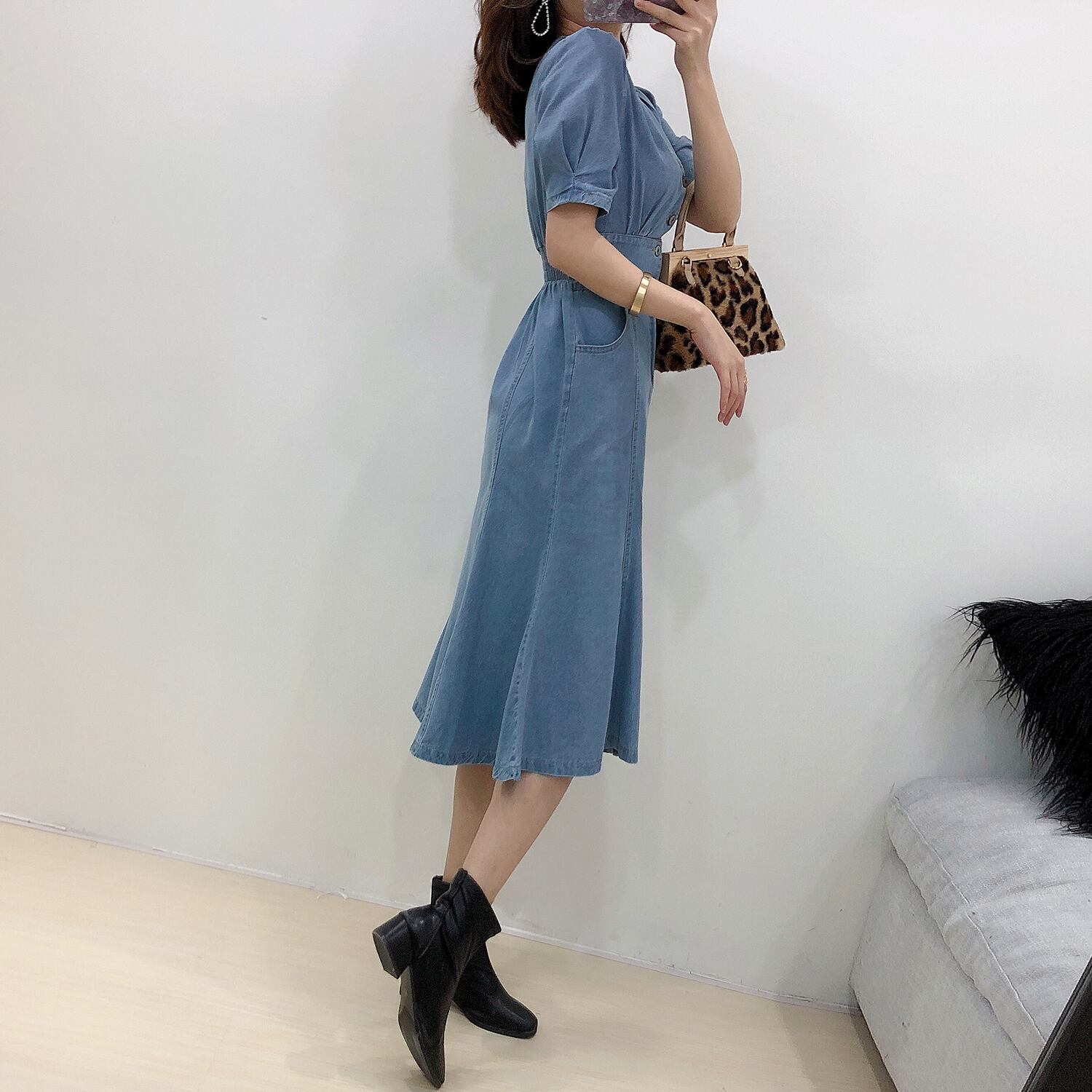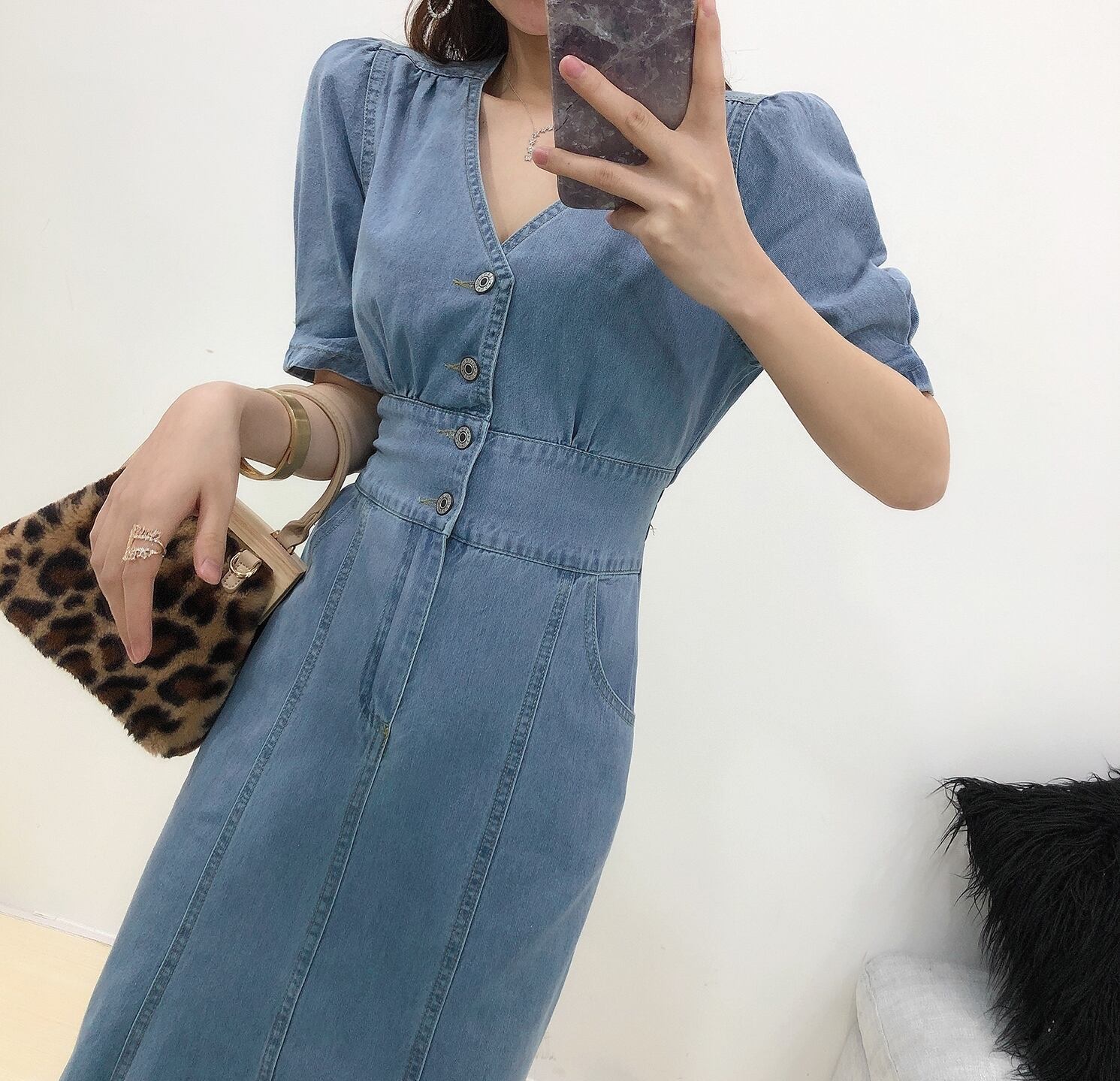 デニムワンピース ワンピース フロントボタン 半袖 ミモレ丈 スリム タイト フロントスリット Vネック ハイウエスト マーメイド カジュアル 大人可愛い きれいめ デート ジーンズ 夏