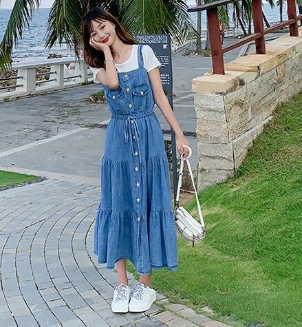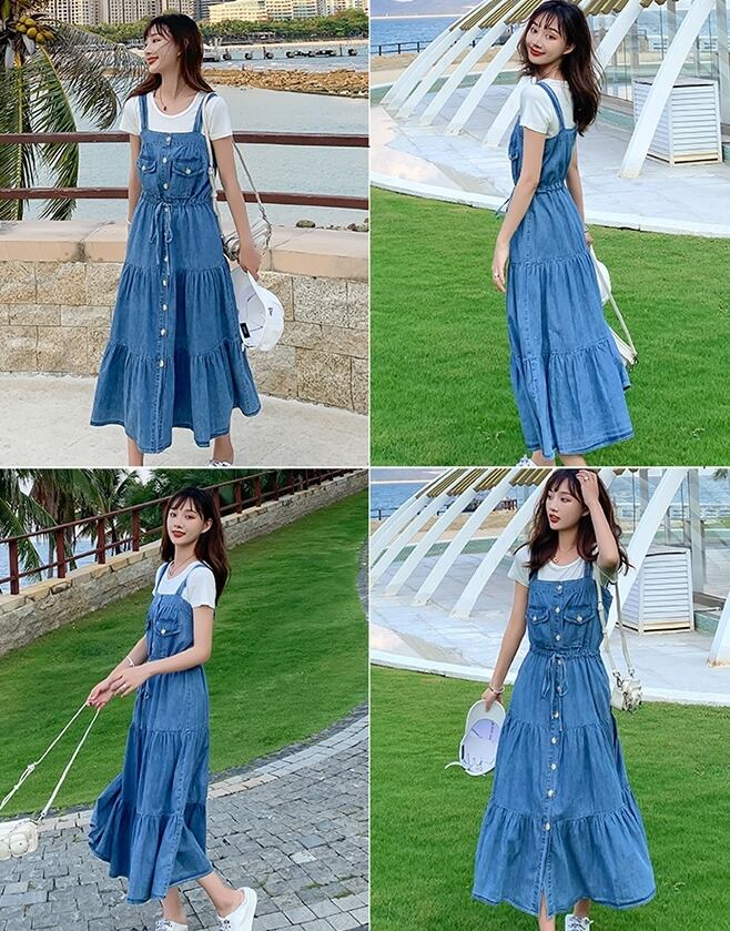 デニムワンピース ティアード キャミソールワンピ フロントボタン ミモレ丈 フレア Aライン 可愛い ウエストリボン ハイウエスト カジュアル デイリー リゾート デート 韓国ファッション 夏