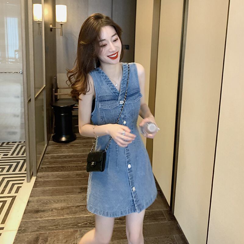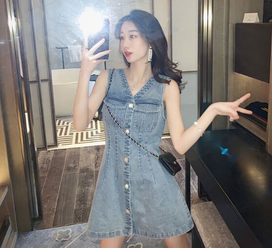 デニムワンピース ワンピース ミニ丈 Vネック フロントボタン 可愛い スリム ノースリーブ カジュアル デイリー お出かけ デート レトロ 韓国ファッション 夏
