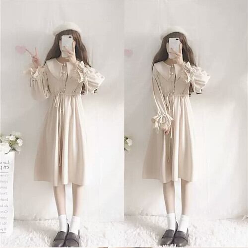 全3色 ひざ丈 ワンピース 襟つき ロリータ 可愛い 大人 シンプル 上品 キレイめ お出かけ お買い物 デート 女子会 秋冬 春 通学 学生 通勤