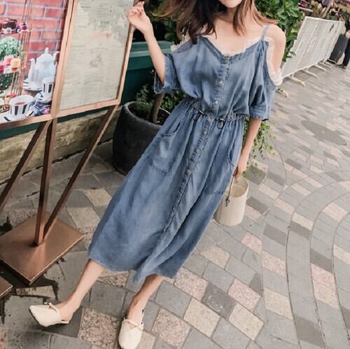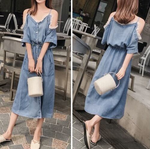 全2色 デニムワンピース ひざ丈 ミディ丈 オフショルダー ウエストリボン カジュアル シンプル レトロ セクシー お出かけ デート リゾート デイリー 夏 ブルー