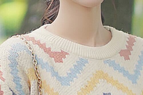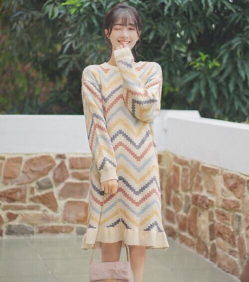 ニットワンピース 膝丈 ラウンドネック 長袖 ドロップショルダー フリル ミックスカラー 秋 冬 大人かわいい 休日コーデ デート 通学 学生 韓国 オルチャン
