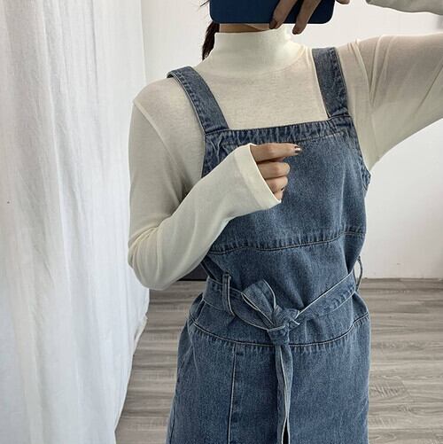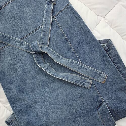 全2色 デニムスカート ジャンパースカート サロペット ロング丈 ウエストリボン スリット カジュアル シンプル レトロ セクシー お出かけ デート リゾート デイリー 夏 ブルー ダークグレー