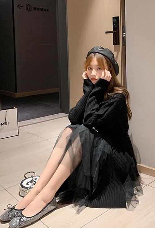 全3色 セットアップ ニットワンピース チュールスカート ハイネック 長袖 ドロップショルダー ロング丈 フリル ピンク ブラック オフホワイト 大人かわいい 韓国 オルチャン フェミニン