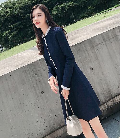 ミニ丈ワンピース ドレス ハイネック 長袖 フリル ネイビー フレア 大人かわいい 秋 冬 上品 エレガント デート 食事会 韓国 オルチャン