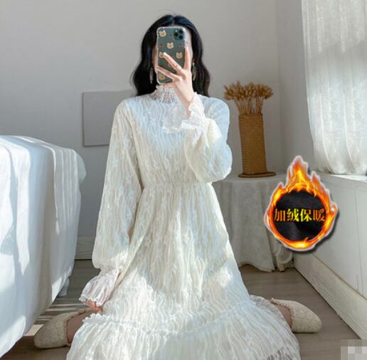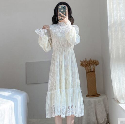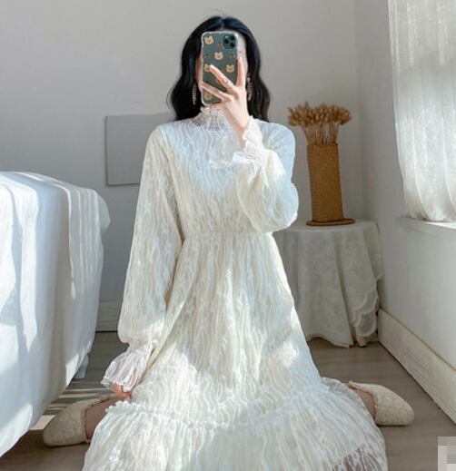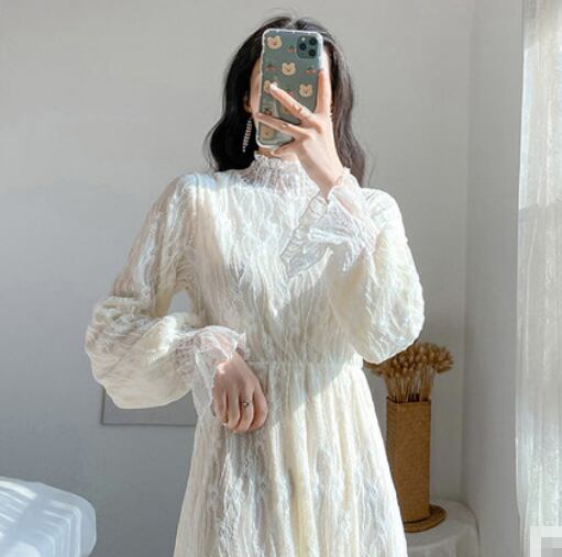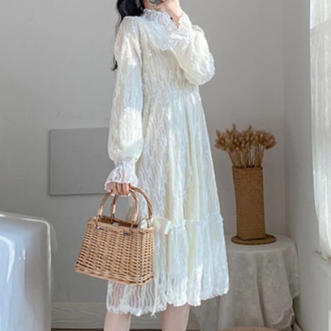 全2種類 ワンピース 総レース ミモレ丈 長袖 ティアード ハイネック Aライン トランペットスリーブ 上品 カジュアル 大人可愛い お出かけ 女子会 デート 秋 冬