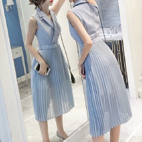 ワンピース ドレス ノースリーブ ミディ丈 ミモレ丈 プリーツスカート ハイウエスト きれいめ シンプル レトロ お出かけ お呼ばれ デート 女子会 リゾート 結婚式 二次会 夏 ブルー