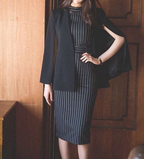 セットアップ スーツ ワンピース ノースリーブ ひざ丈 ミディ丈 ハイウエスト タイトスカート ジャケット 羽織 長袖 きれいめ カジュアル セクシー シンプル レトロ お出かけ パーティ フォーマル オフィス ストライプ 夏