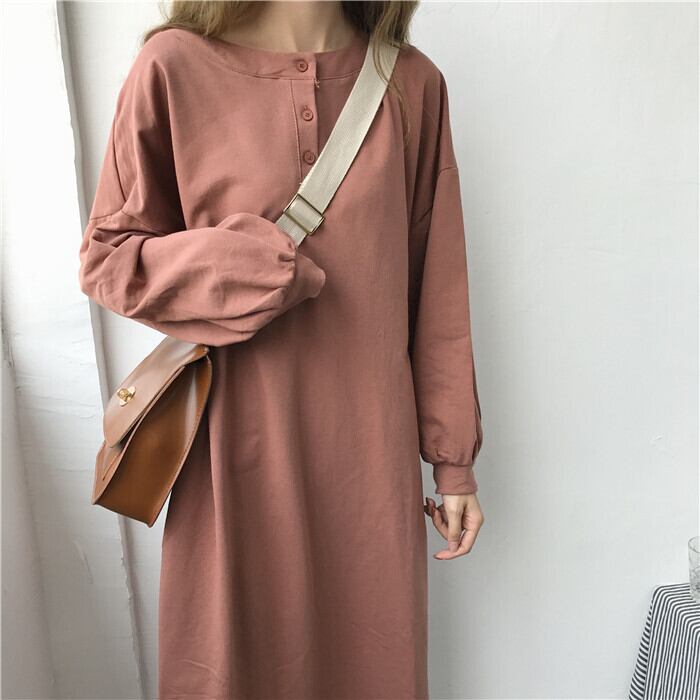全3色 ワンピース ロゴ入り ロング丈 スリット Tシャツワンピース ラウンドネック ネックボタン 長袖 ゆったり オーバーサイズ カジュアル 韓国ファッション クール ラフ 体型カバー 春