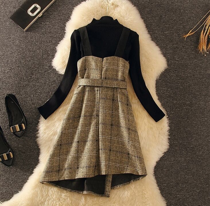 セットアップ 2点セット ツーピース ワンピース セーター ニット チェック柄 ベルト スリム きれいめ カジュアル デート ハイネック 大人可愛い アシンメトリー 韓国 秋 春 冬