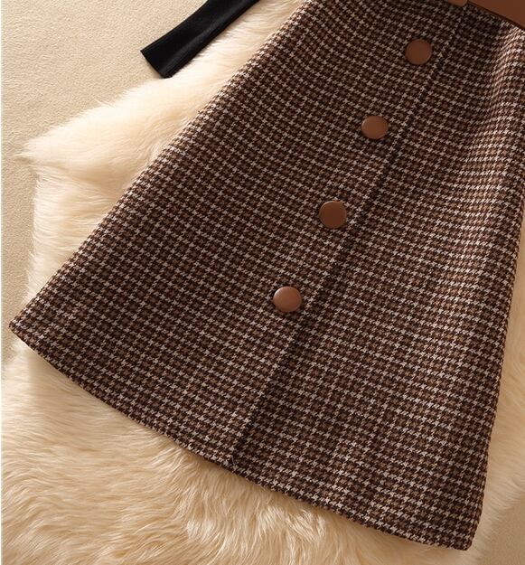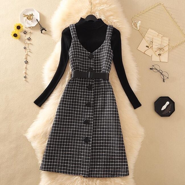 全4色 セットアップ ツーピース 2点セット ワンピース スリム プルオーバー フロントボタン ハイネック チェック柄 ベルト 大人 カジュアル きれいめ デート 女子会 上品 トレンド 秋 春 冬