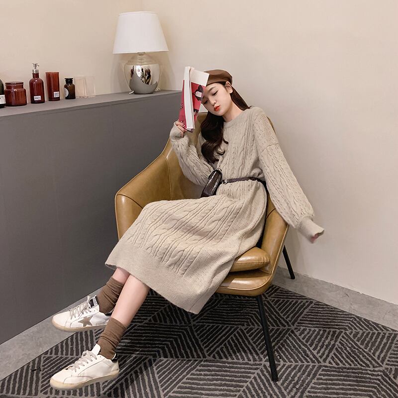 全2色 ワンピース ニットワンピース セーター ツイストニット ゆったり オーバー ミモレ丈 ラウンドネック ロングスリーブ 体型カバー 韓国ファッション 秋 春 冬