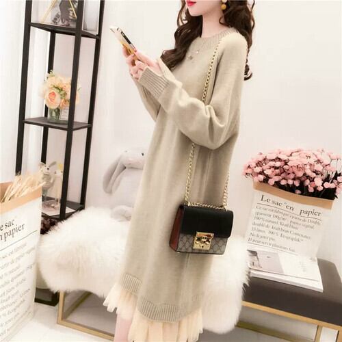 全3色 ミドル丈 ニット ワンピース シフォン 長袖 大人 シンプル 無地 カジュアル キレイめ 上品 お出かけ お買い物 デート 女子会 秋冬 春 通学 学生 通勤 韓国ファッション