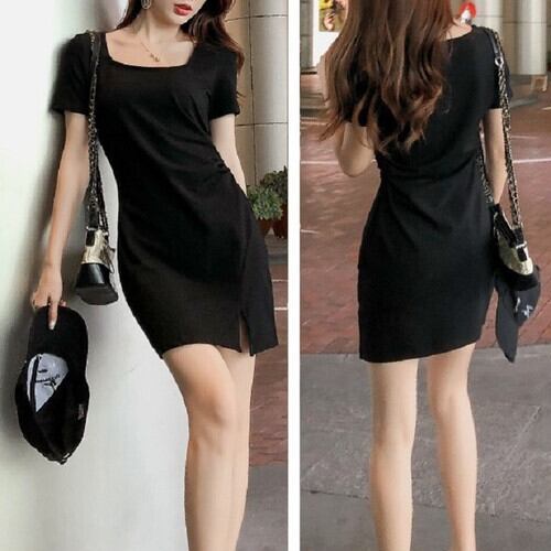 大きいサイズ ワンピース ドレス ミニ丈 スリット スクエアネック 半袖 カジュアル セクシー かわいい フェミニン シンプル レトロ お出かけ デート お呼ばれ デイリー 普段着 夏 ブラック