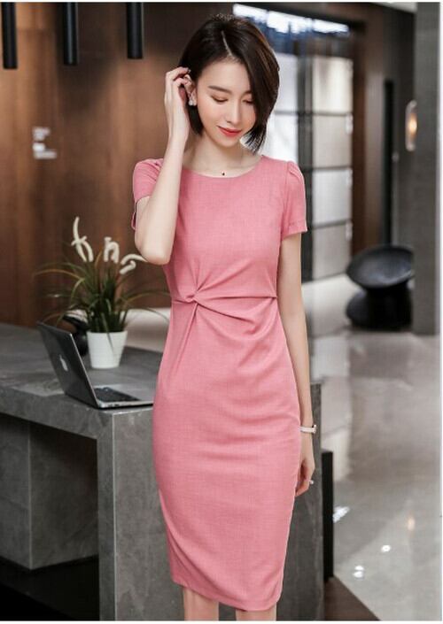全3色 ひざ丈ワンピース ミドルウェスト ポリエステル シフォン 無地 ラウンドネック 半袖 バックシャン 上品 OL 通勤