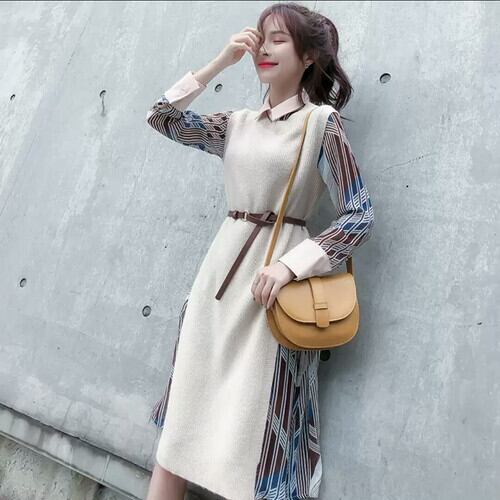 全2色 セットアップ ベストつき ワンピース ツーピース ミディアム丈 ひざ丈 大人 カジュアル キレイめ シンプル 上品 お出かけ お買い物 デート 女子会 秋冬 春 通学 学生 通勤 韓国ファッション