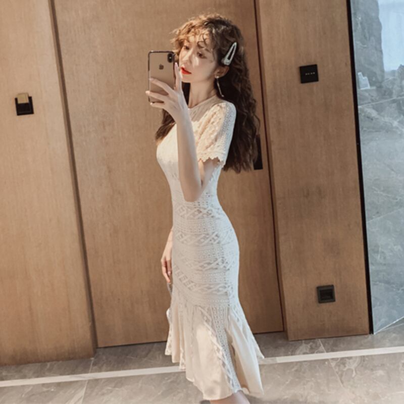 メッシュレースが上品なマーメイドワンピースドレスです。