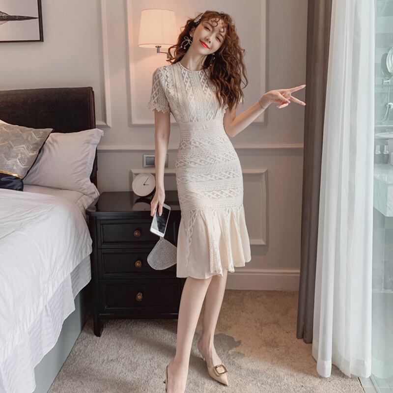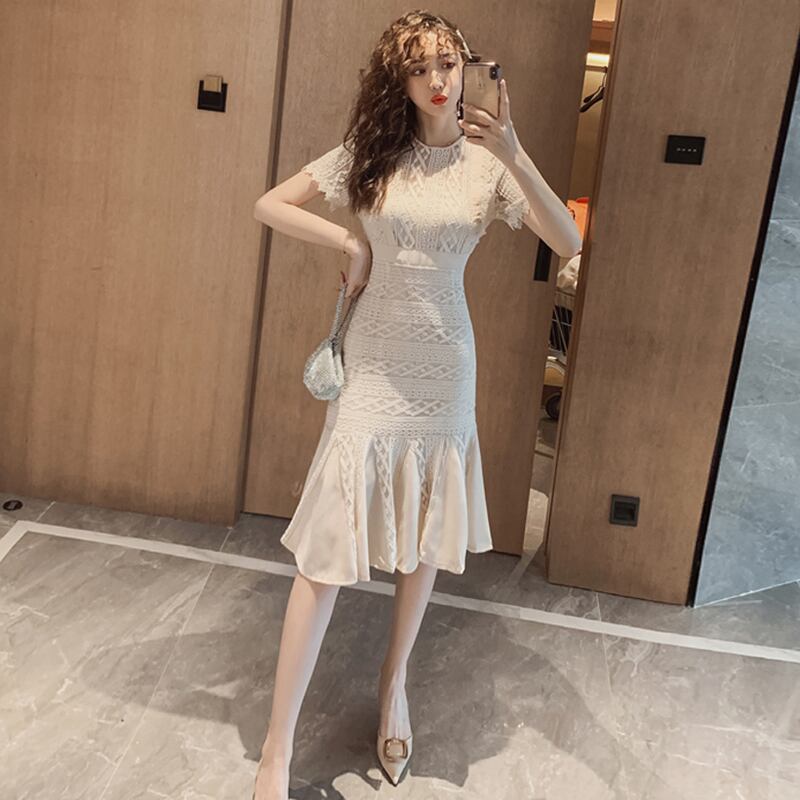 ワンピース ドレス マーメイド ひざ丈 レース 半袖 タイト スリム クルーネック フリル きれいめ ガーリー 大人可愛い パーティー お呼ばれ 上品