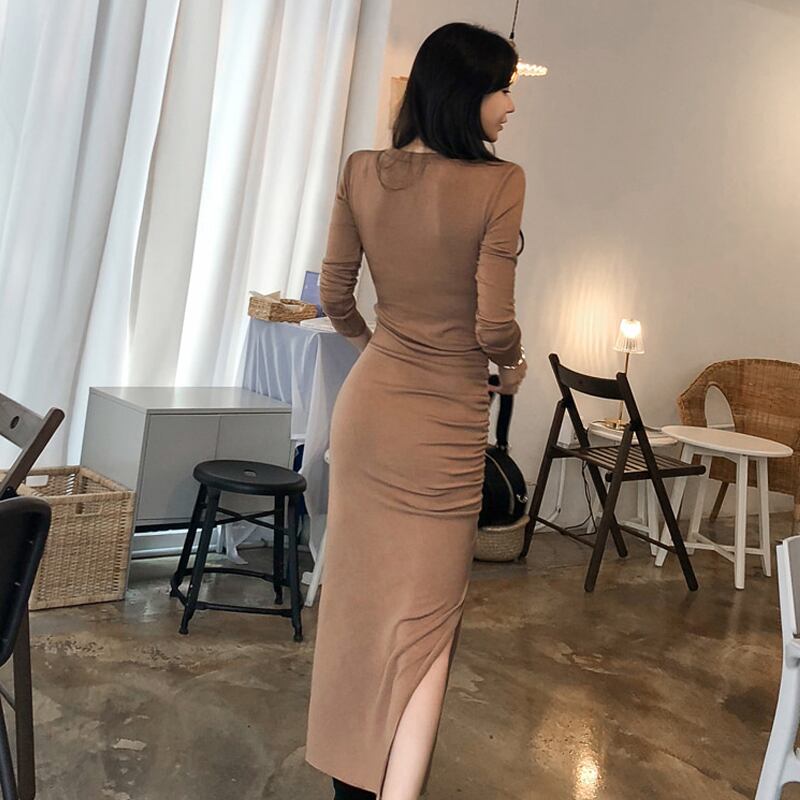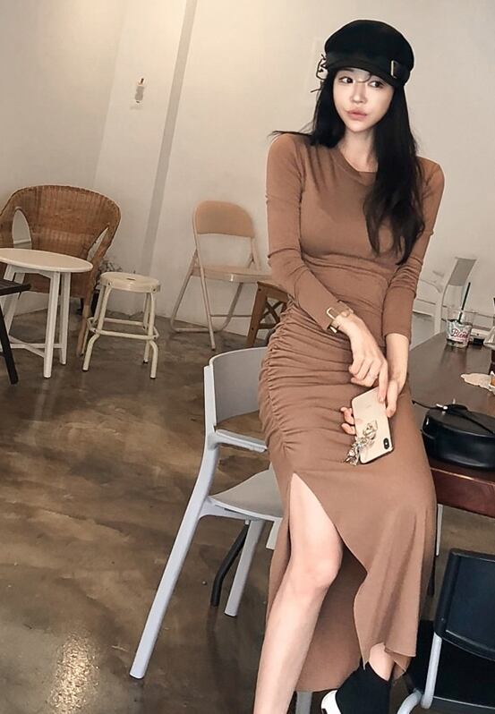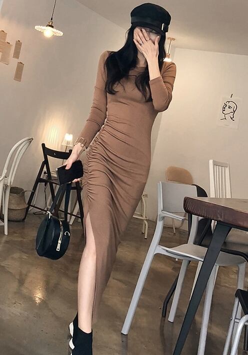 ワンピース スリット 長袖 ドレップ タイト セクシー 上品 秋 春 クルーネック ロング丈 デート きれいめ カジュアル 無地