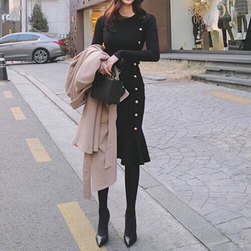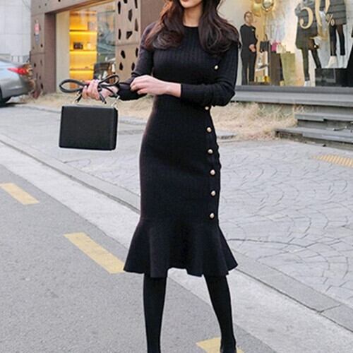 ニットワンピース ロング ひざ丈 フィッシュテール タイト 長袖 フリル ラウンドネック セクシー お出かけ デート パーティ ブラック 秋冬