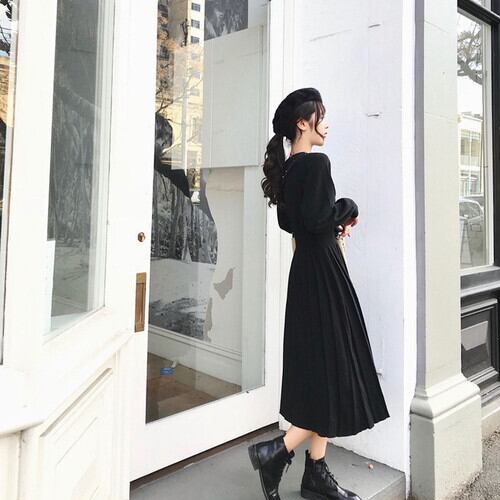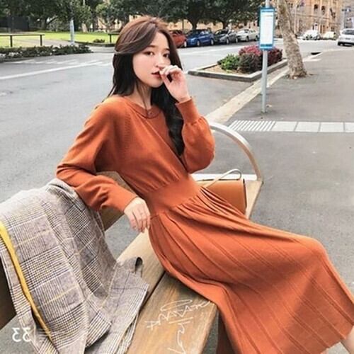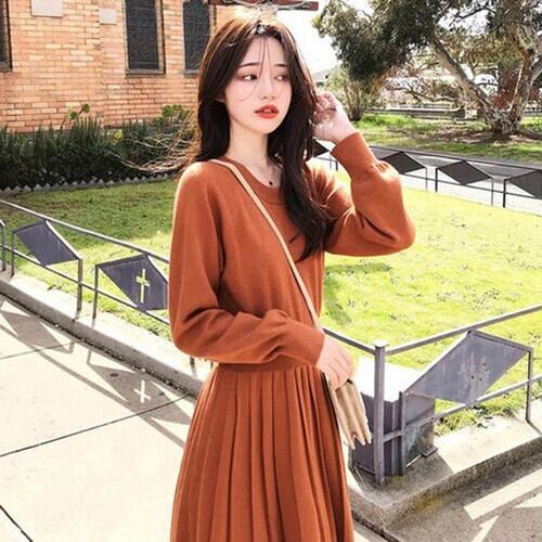 全3色 ニットワンピース Aライン ミモレ丈 大人可愛い 秋冬 お出かけ ラウンドネック 長袖 無地 プリーツ