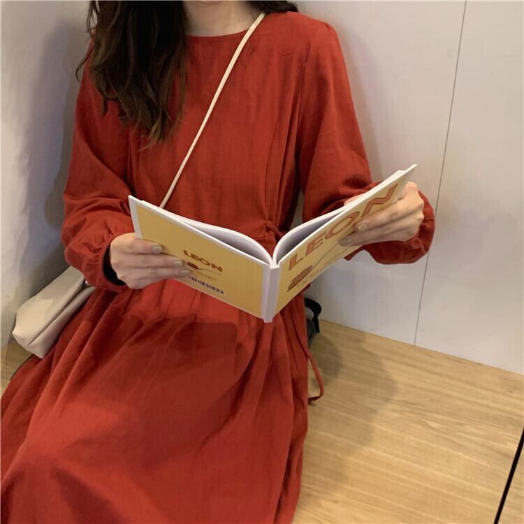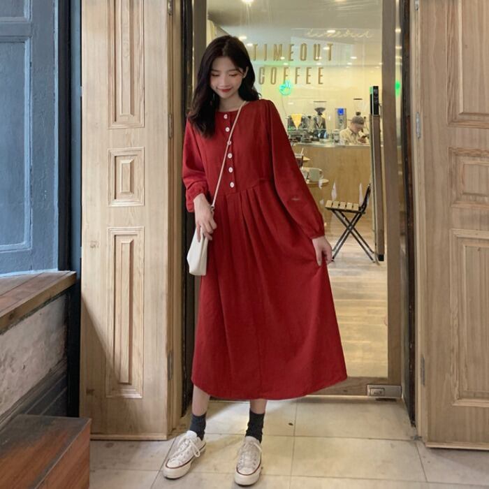 全2色 2WAY ワンピース シンプル ミモレ丈 長袖 Aライン ラウンドネック ゆったり ボタン カジュアル デイリー 大人 フレア レトロ お出かけ 無地 夏 秋