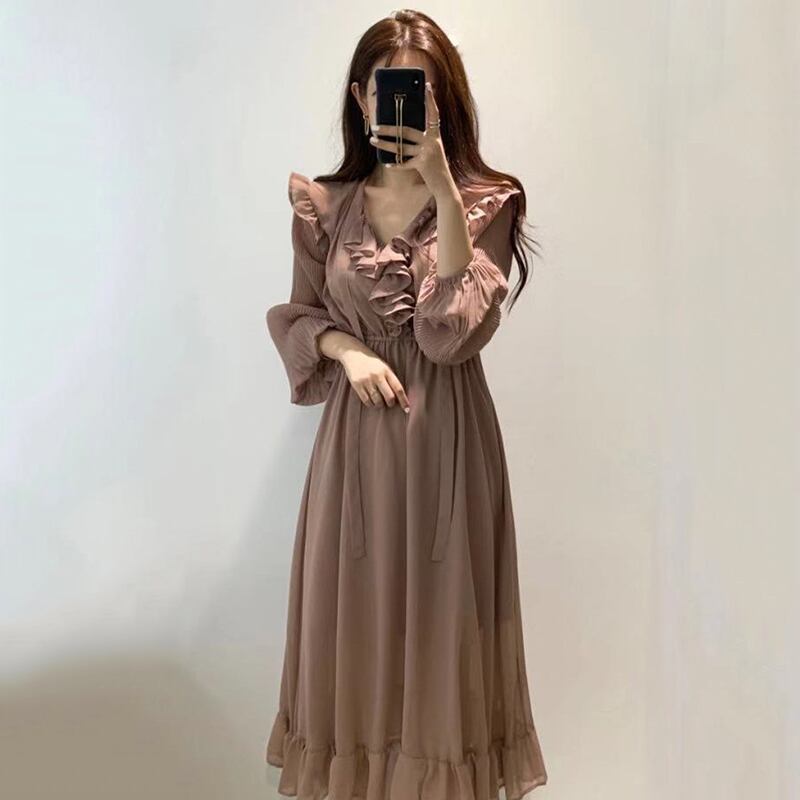ワンピース ミモレ丈 フリル 長袖 シフォン Vネック フレア 大人可愛い 上品 お出かけ カジュアル ウエストシャーリング プリーつけて きれいめ デート 女子会 夏 秋
