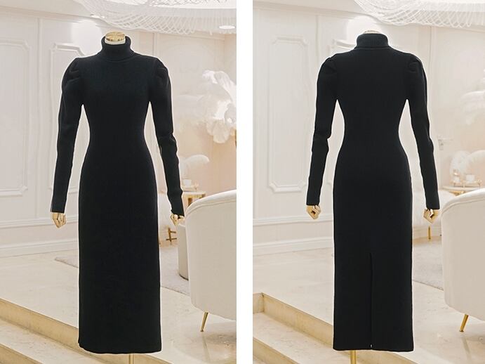 全2色 ワンピース ニットワンピース リブニット スリット あったか 袖コンシャス ミモレ丈 タイト デート カジュアル 大人可愛い ハイネック スリム 秋 冬 春