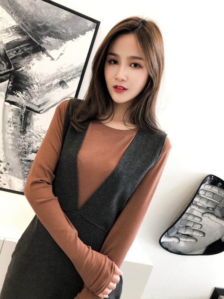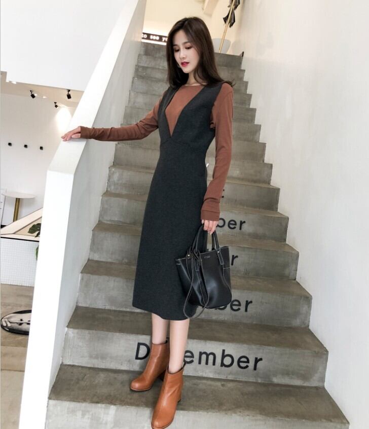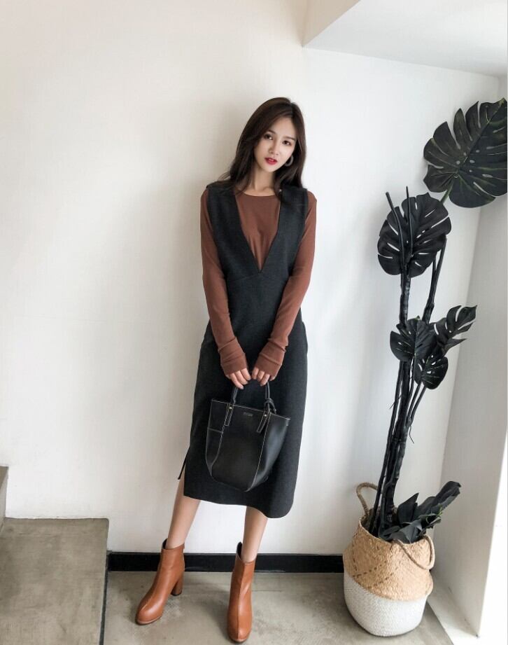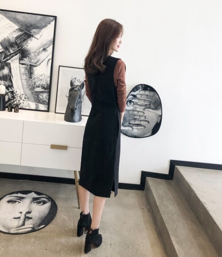 全2色 ワンピース ジャンパースカート ノースリーブ ミモレ丈 スリム Vネックシンプル きれいめ スリット カジュアル 上品 デート 大人 無地 秋 冬 春