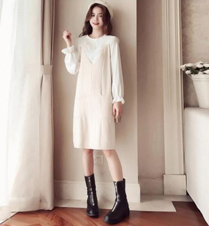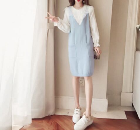 全3色 セットアップ ツーピース 2点セット ジャンパースカート ブラウス トップス レース ワンピース ひざ丈 ラウンドネック フリル ガーリー きれいめ カジュアル ゆったりめ 長袖 秋 冬 春