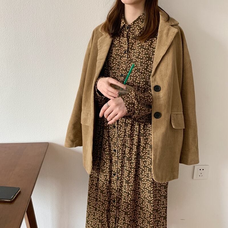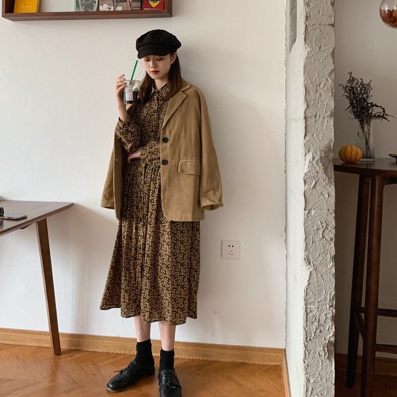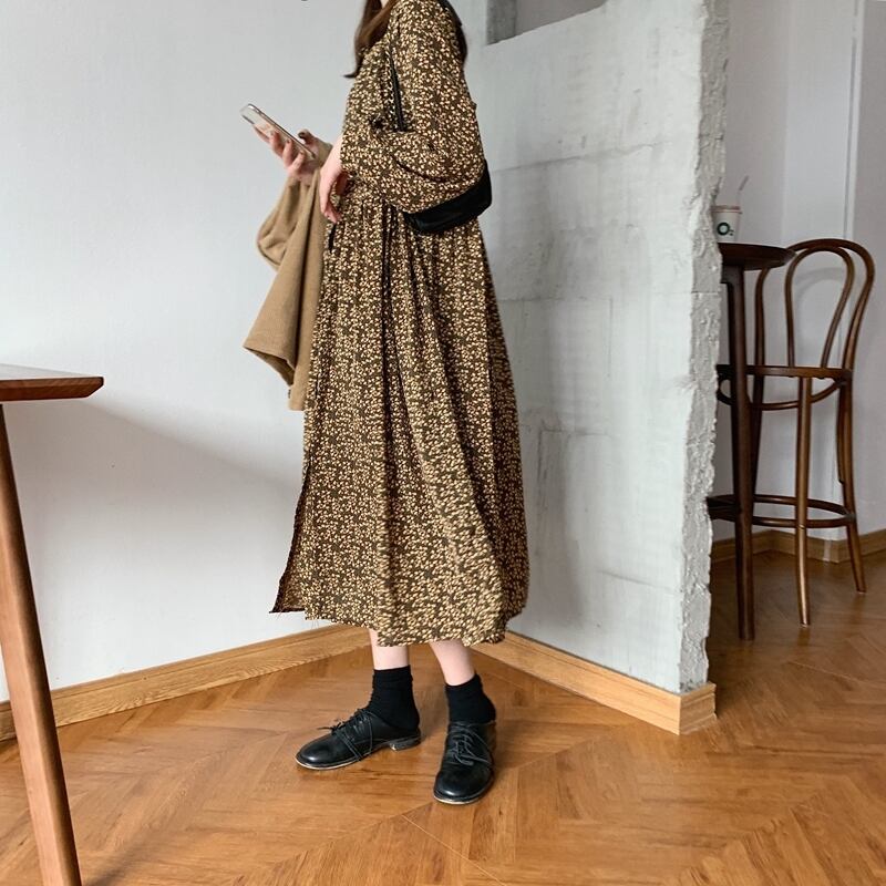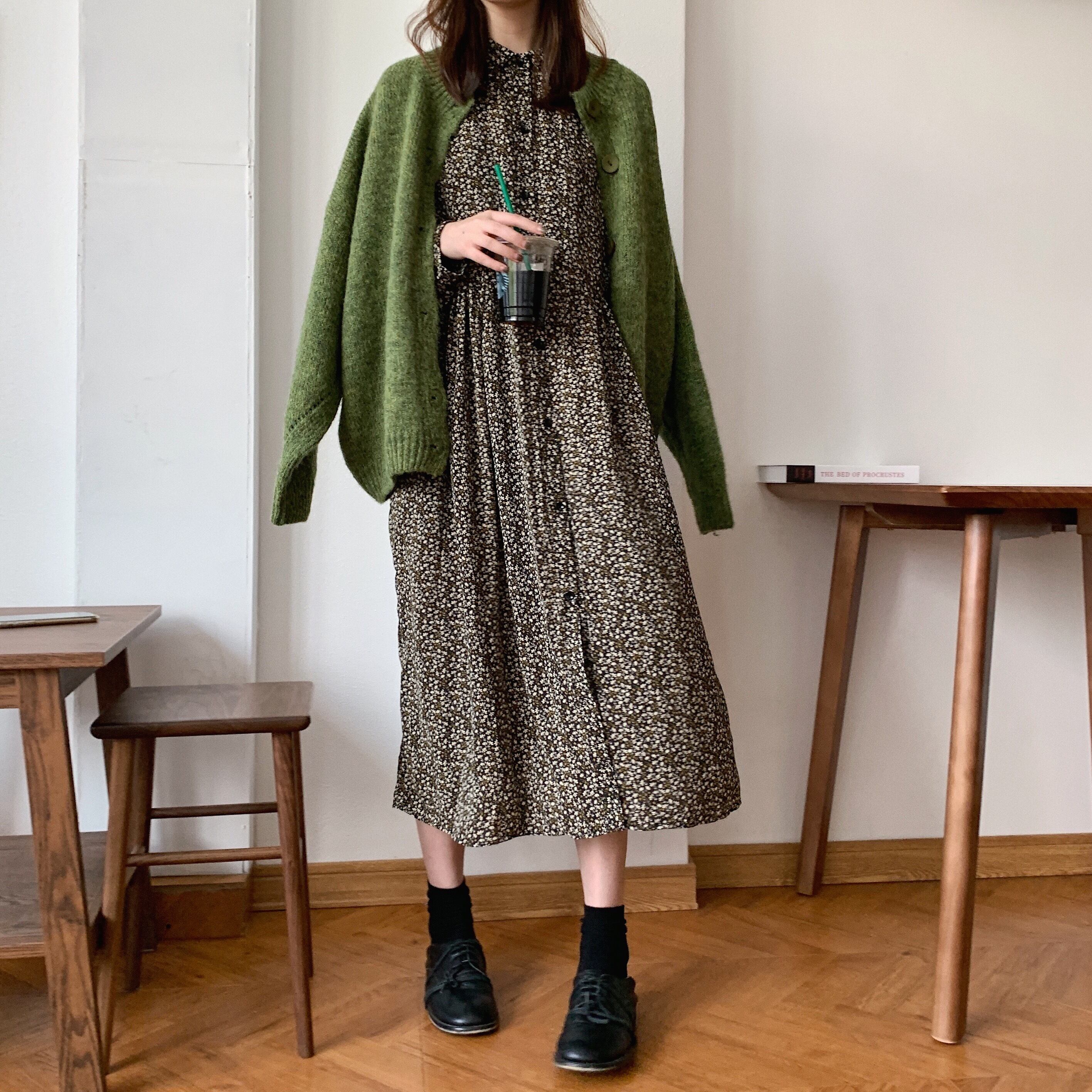 全2色 ワンピース シャツワンピース フロントボタン ミモレ丈 ビッグシルエット 長袖 お花柄 カジュアル デイリー デート ゆったり フレア 秋 冬 春