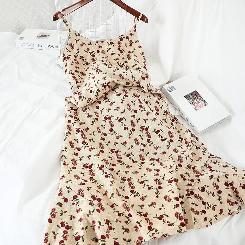 全3色 ワンピース ミモレ丈 キャミワンピース フレア フリル カジュアル 大人可愛い デート リソース デコルテ ガーリー 花柄 夏 春