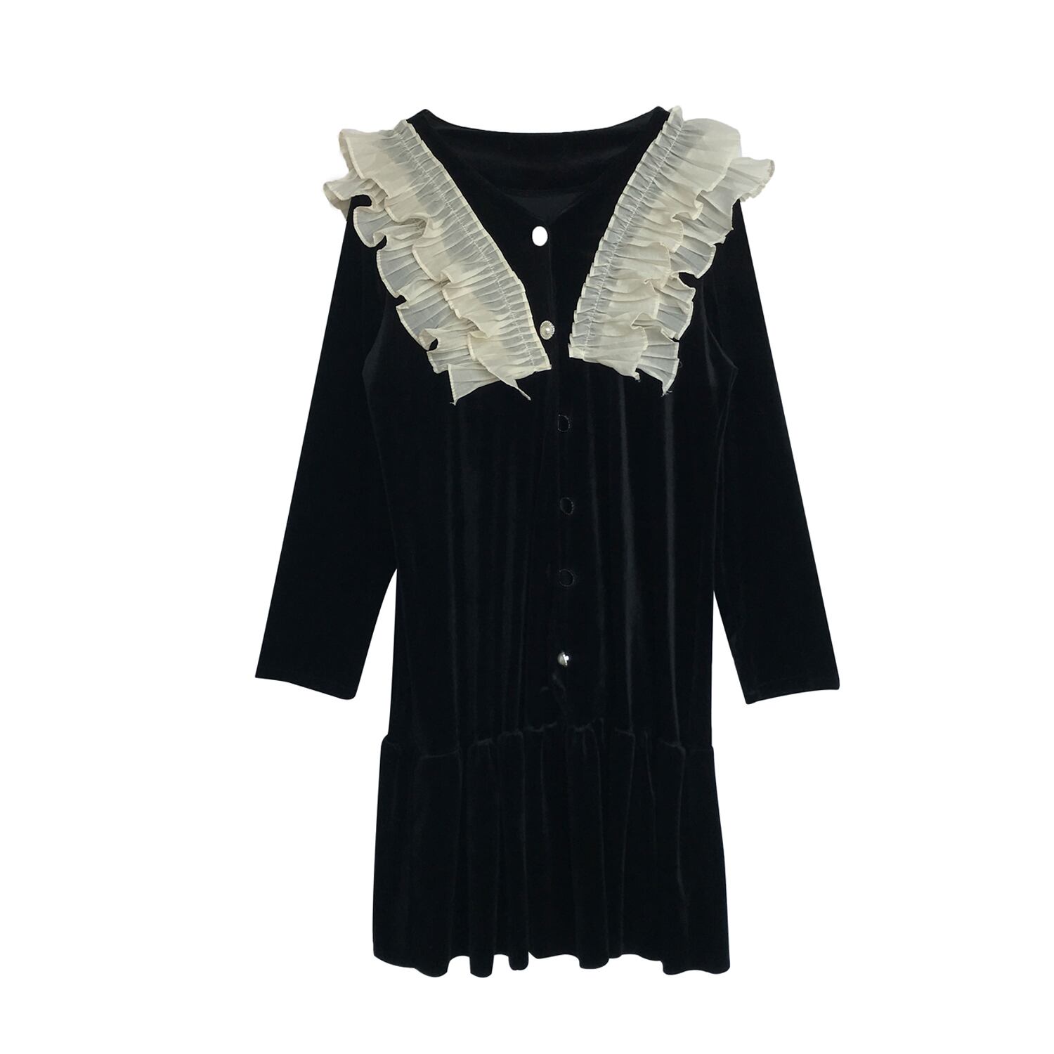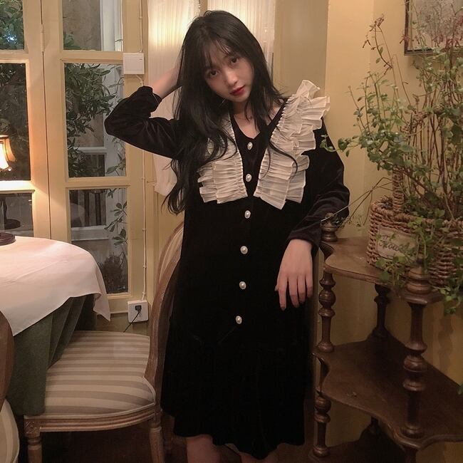 ワンピース ショート丈 フロントボタン Vネック フリル フレア 長袖 スリム ガーリー 可愛い デート 上品 バイカラー カジュアル きれいめ