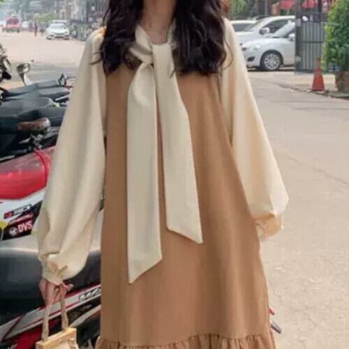 シンプル ボウタイつき セットアップ ワンピース ブラウス シャツ ロング丈 ゆったり 大人カジュアル 可愛い シンプル キレイめ お出かけ お買い物 デート 女子会 秋冬 春 通学 学生 通勤 韓国ファッション