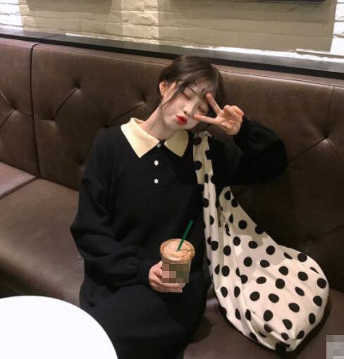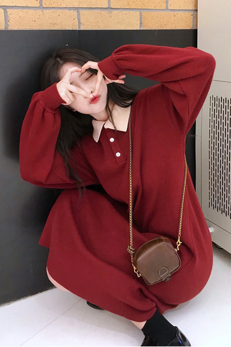 全2色 ワンピース ミモレ丈 ポロネック ボタン シャツワンピース パフスリーブ ゆったり 体型カバー カジュアル デイリー 長袖 春 秋