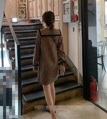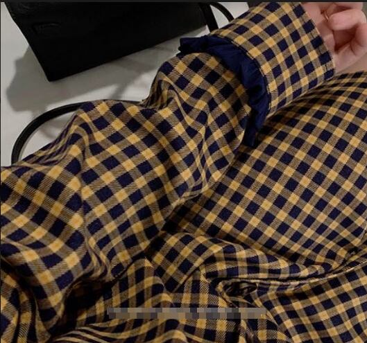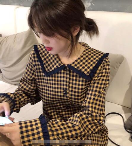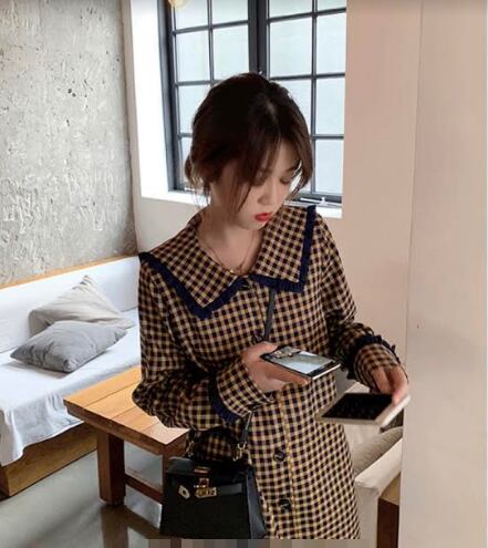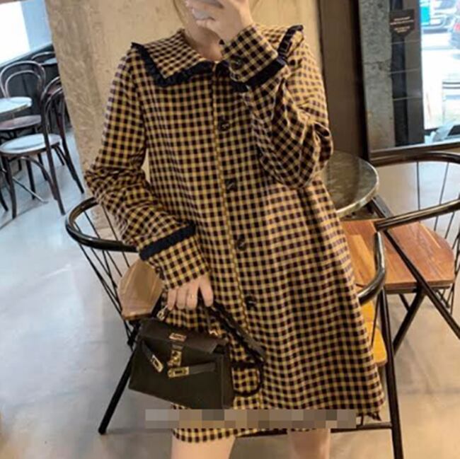 全2色 ワンピース ミニ丈 チェック柄 長袖 ゆったり カジュアル シャツワンピース フロントボタン ネックフリル ゆったり 大人可愛い 大人 デート レトロ 秋 冬 春