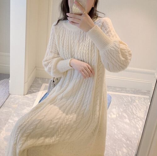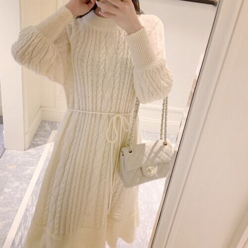 ニットワンピース ドレス ロングワンピース フレアドレス レトロ ホワイト 大人可愛い ラウンドネック 長袖 ラグランスリーブ ウエストリボン デート 休日 韓国 オルチャン