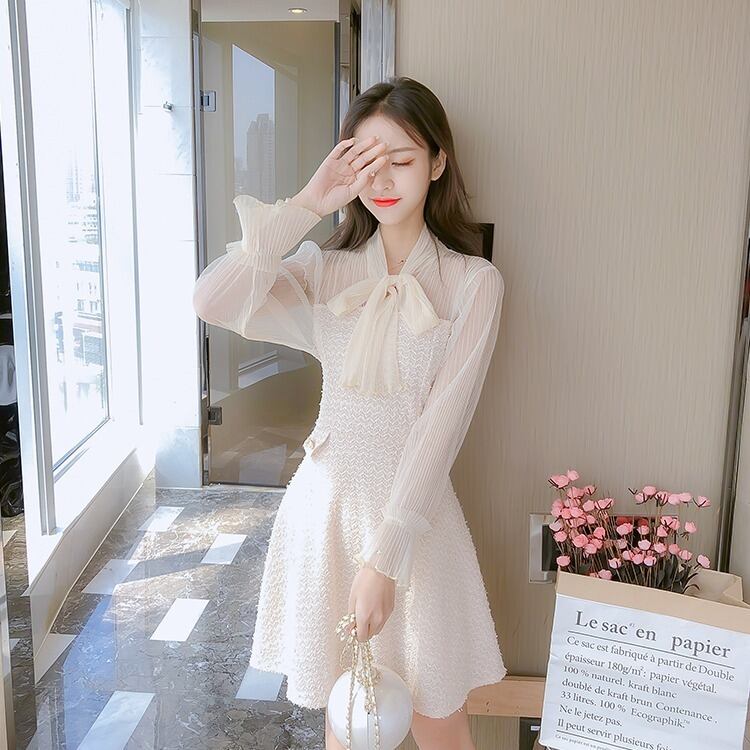 全2色 ワンピース ドレス レディース メッシュ シースルー レース ボンタイ ひざ丈 ミモレ丈 無地 ベルスリーブ スリム フィット 長袖 ガーリー お呼ばれ 結婚式 二次会