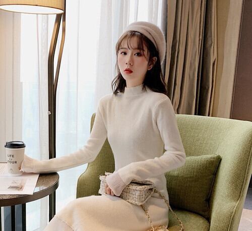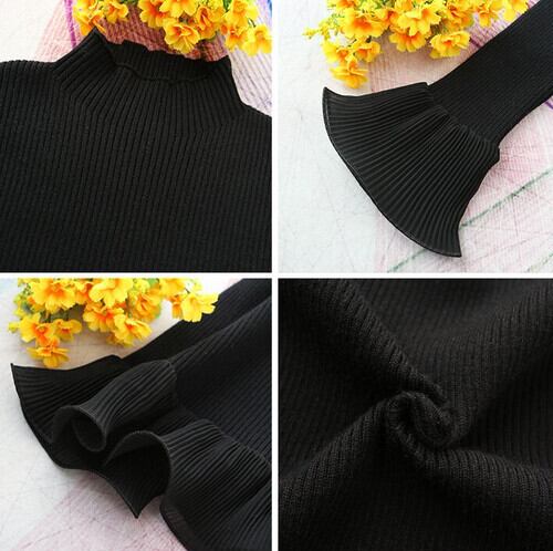 全2色 ニットワンピース ニットドレス ハイネック 長袖 リブニットドレス ブラック ホワイト ブルー 大人かわいい スリム ロング丈 韓国 オルチャン フリル シフォン